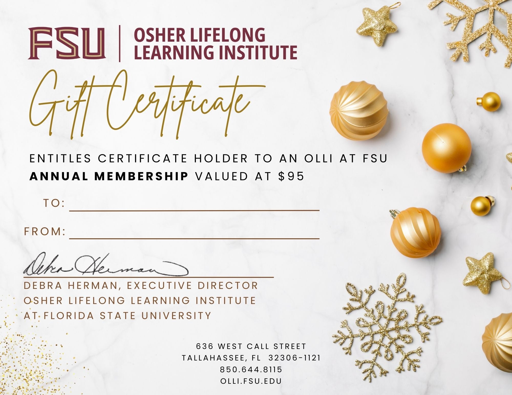 If you have questions or need assistance choosing the right gift certificate, please contact OLLI at FSU at OLLI@fsu.edu or call 850-644-8115. We’re happy to help.