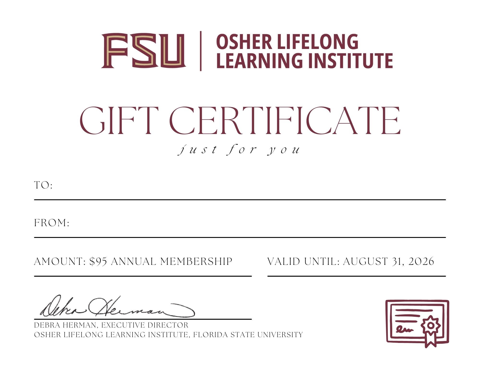 Gift certificates are available online and can be purchased in just a few minutes. After purchase, recipients will receive instructions on how to redeem their gift and begin enjoying OLLI at FSU.