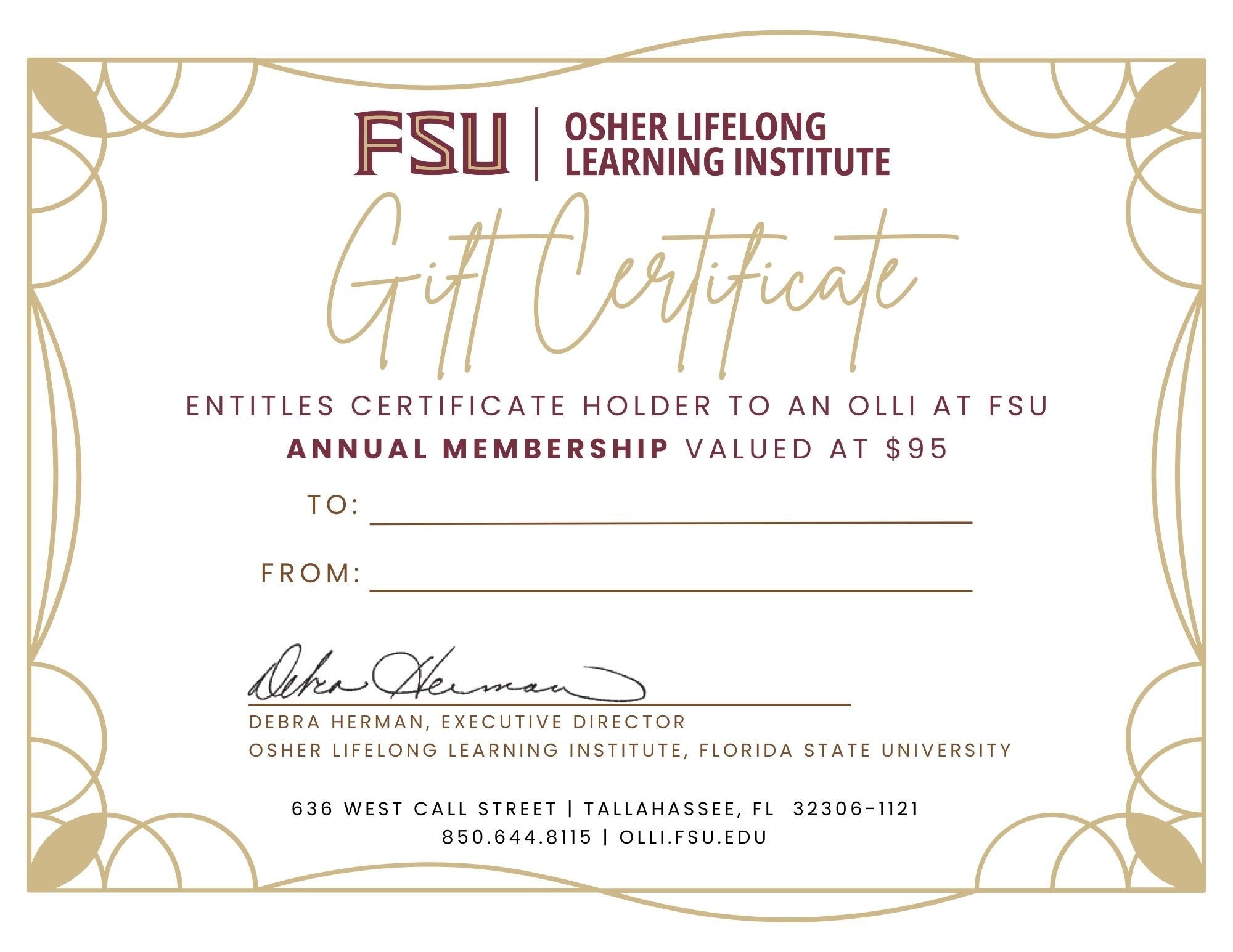 If you have questions or need assistance choosing the right gift certificate, please contact OLLI at FSU at OLLI@fsu.edu or call 850-644-8115. We’re happy to help.